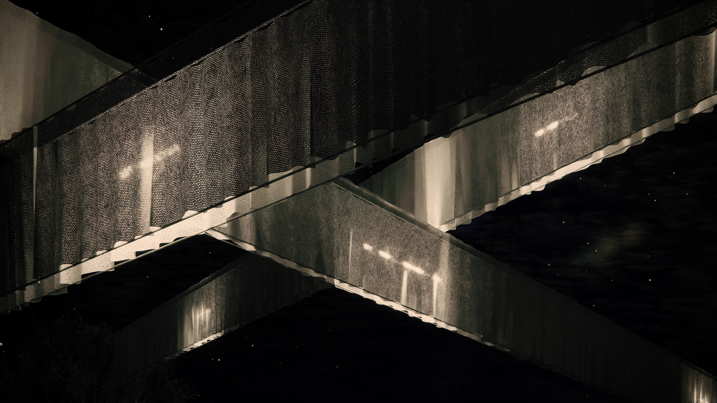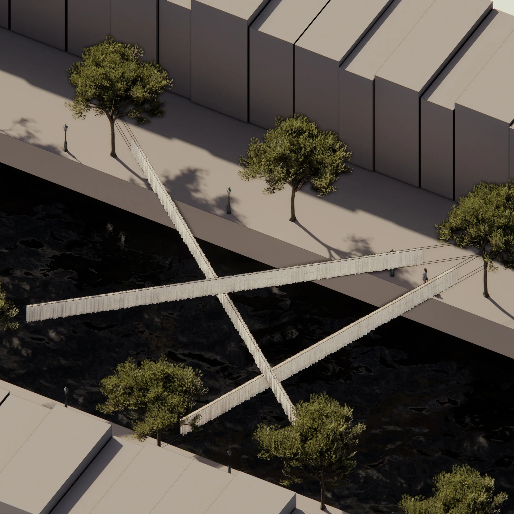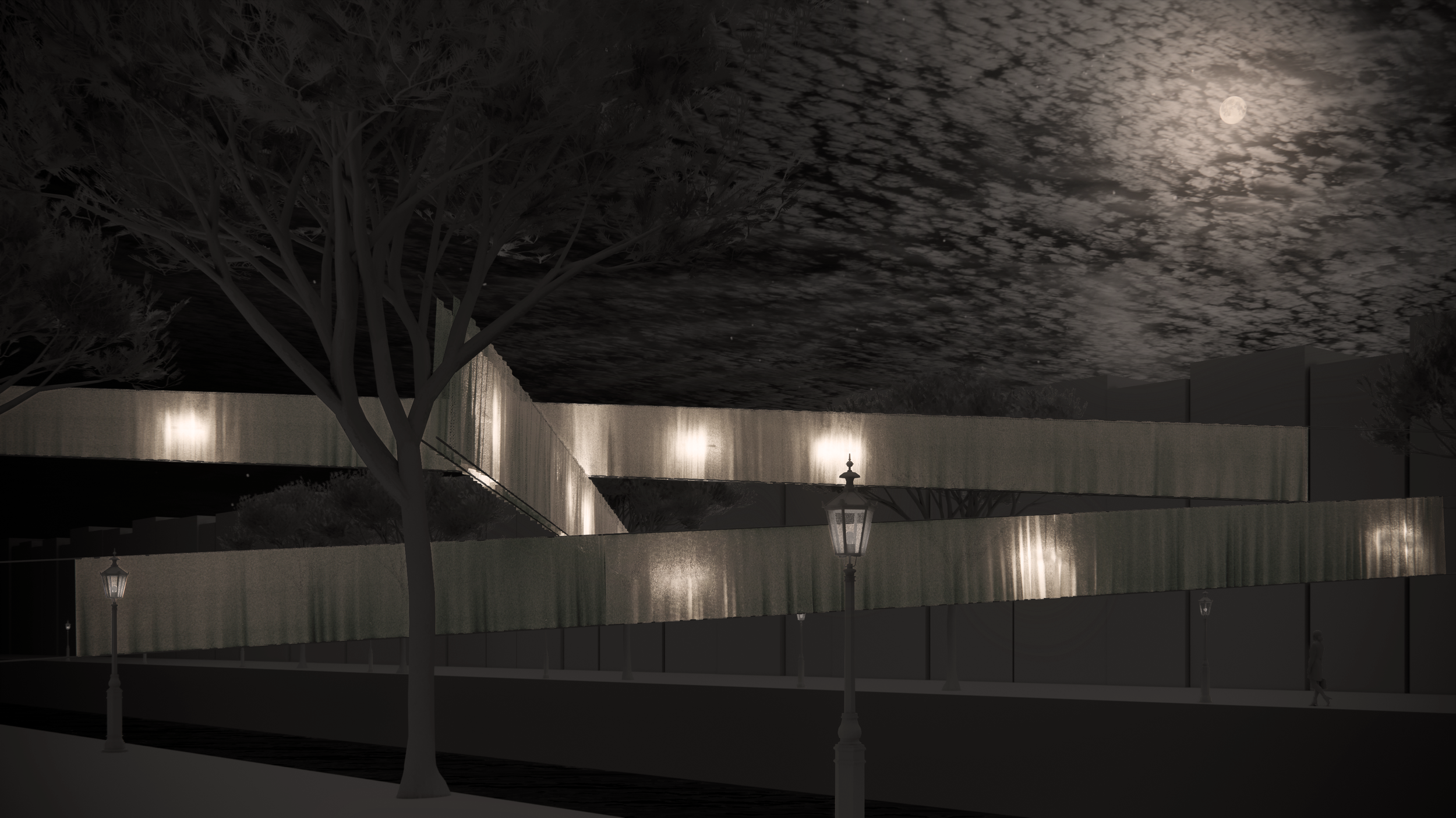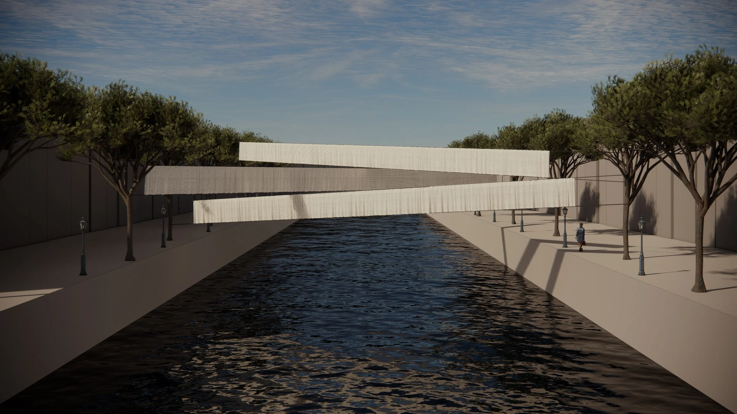 Where do we go when we die? Above? Below? Maybe we just vanish. This installation visualizes that transition with a series of glowing paths, like spirits behind a veil, as they make their way back and forth across the canal. Visitors who approach this installation will find it takes on different forms from different angles. The three fabric sails transform in the breeze, adding layers of opacity or transparency depending on the viewer's position. Due to the varying angles of the sails, the different lengths and the multiple points of intersection, an observer will find the piece comes alive in different ways each time they visit.