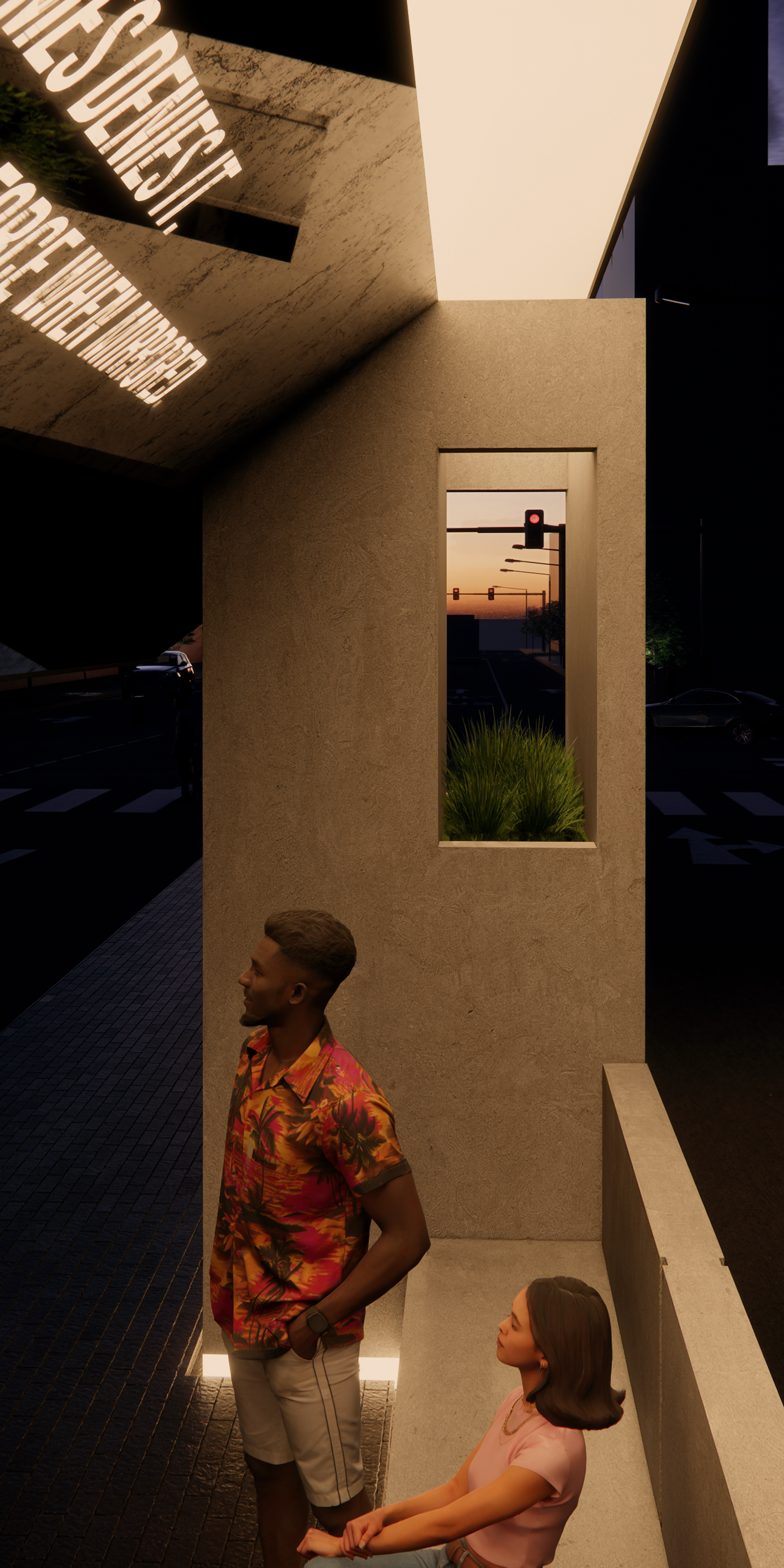 This bus rapid transit station is located in a prominent commercial corridor which connects unique neighborhoods, old and new. The residents are as unique as the neighborhoods they live in. This station gives the residents, who will soon rely on this transit line, a chance to connect with each other using a simple tool - the mirror. The quote embedded in the polished steel panel comes from Italo Calvino’s Invisible Cities. Its purpose is to draw the attention of the riders to the surface overhead. In reading the quote, provided in English and Spanish (the two most spoken languages of the corridors riders), the riders might catch a glance of their fellow rider as they too read the quote above. Maybe even giving them something to have a conversation about as they wait.